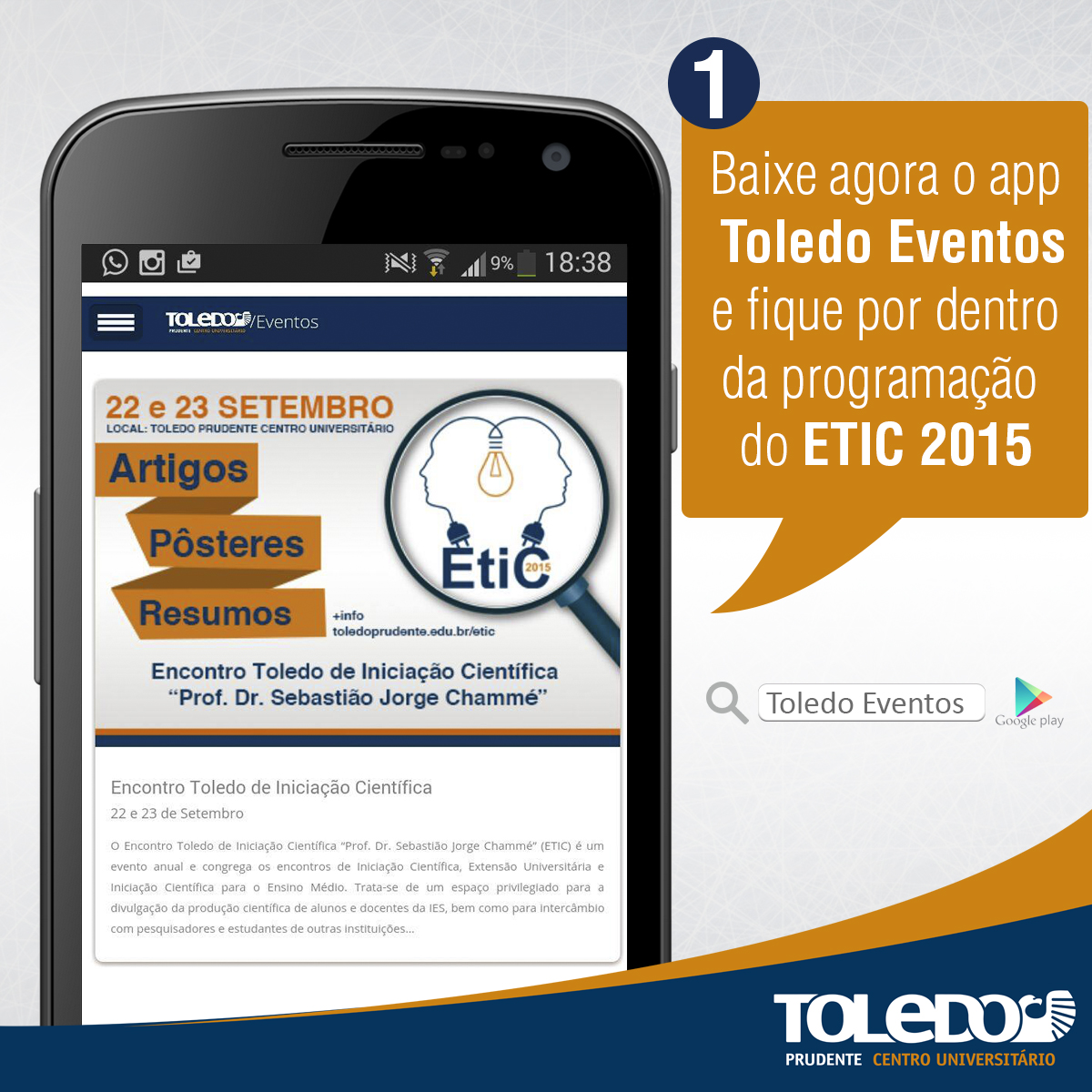ETIC 2015 – Será realizado nos dias 22 e 23 de setembro na Toledo Prudente. Podem participar alunos, ex-alunos daToledo Prudente e de outras instituições de ensino superior, estudantes do ensino médio, pesquisadores, professores e outros interessados em integrar um dos mais esperados eventos de pesquisa científica da região.