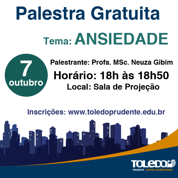 Ansiedade – como administrá-la? A temática será abordada pela segunda vez pela psicopedagoga da Toledo Prudente Centro Universitário, Neuza Gibim, no dia 7 de outubro das 18h às 18h50 na Sala de Projeção Professor Pascoal Dinis Navarro