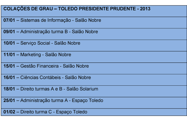 Têm início o período de realização das cerimônias de colação de grau dos formados dos cursos de Administração, Ciências Contábeis, Direito, Gestão Financeira, Marketing, Serviço Social e Sistemas de Informação da Toledo Presidente Prudente.