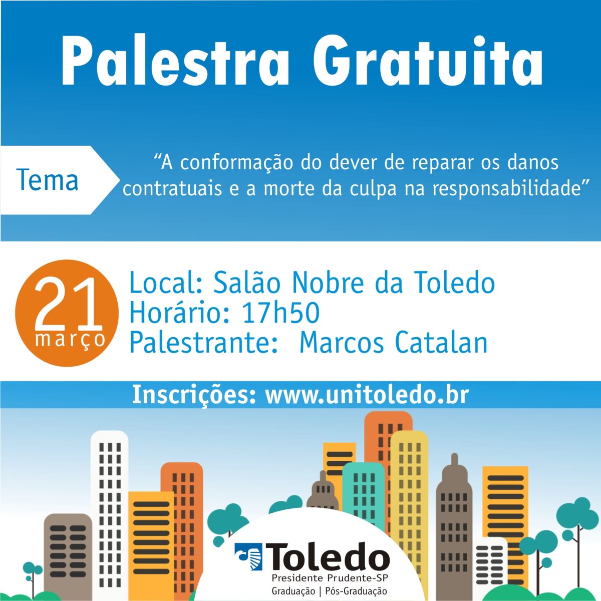 Na próxima sexta –feira (21), às 18h, a Toledo Presidente Prudente promoverá, por meio do Ciclo de Palestras Toledo na Cidade, a apresentação “A conformação do dever de reparar os danos contratuais e a morte da culpa na responsabilidade”, que será apresentada pelo professor dos cursos de pós-graduação em Direito da Toledo, Marcos Jorge Catalan.
