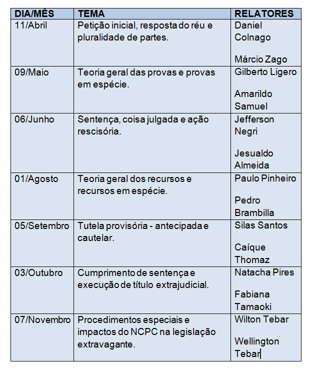 A programação é inspirada no Fórum Permanente de Processualistas Civis, evento que vem ocorrendo sob a coordenação de Fredie Didier, do qual participam professores de processo de todo o Brasil com o intuito de discutir o Novo CPC.