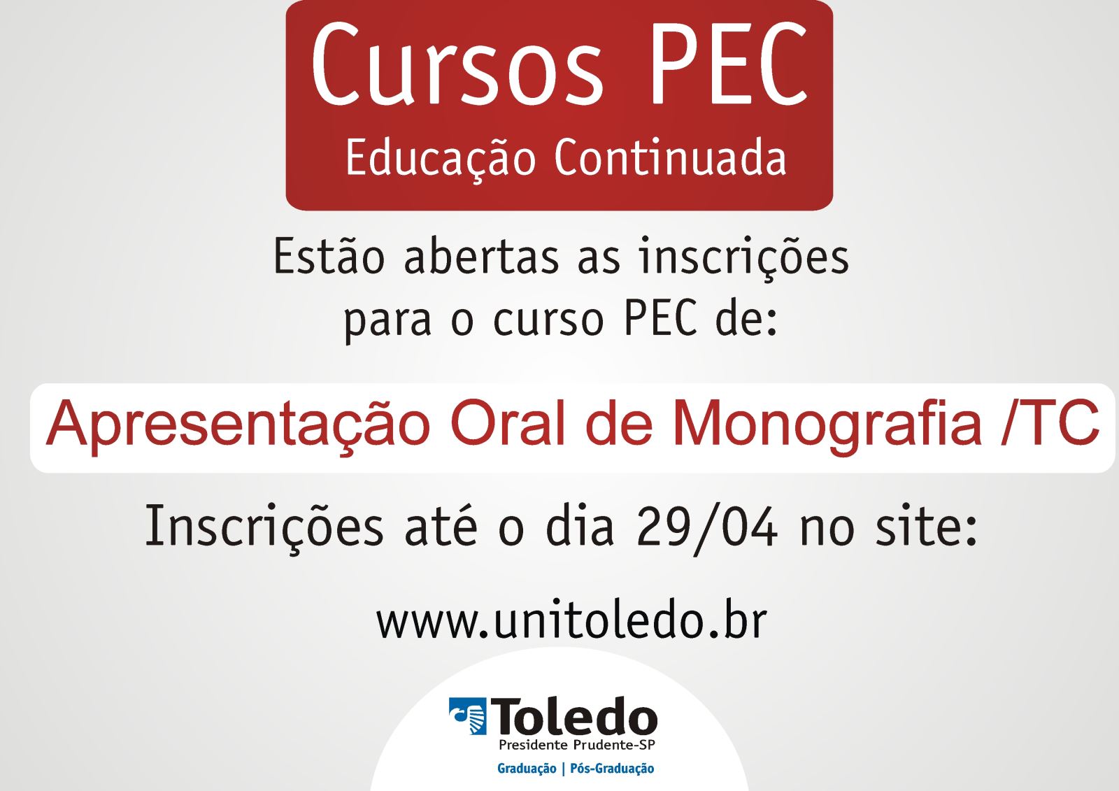 A Toledo Presidente Prudente, por meio do Programa de Educação Continuada (PEC), está com inscrições abertas para o curso de apresentação oral de monografia/TC até o dia 29 de abril ou enquanto houver vagas.