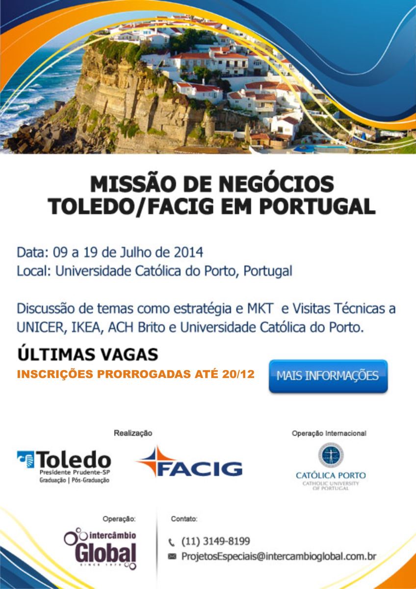 Devido a grande procura, a Toledo Presidente Prudente acaba de prorrogar as inscrições para o Programa de Extensão Internacional – Missão de Negócios Toledo em Portugal. Agora, as inscrições poderão ser feitas até 20 de dezembro de 2013.