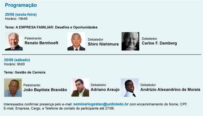 Para iniciar o Seminário, no dia 29 (sexta-feira), às 19h15, Renato Bernhoeft (foto 1), que é consultor de empresas familiares desde 1975, tendo colaborado com a profissionalização de grandes como Sadia, Marcopolo, Berti e outros, sendo referência no assunto no Brasil, irá fala sobre desafios e oportunidades das empresas que são geridas por uma família.