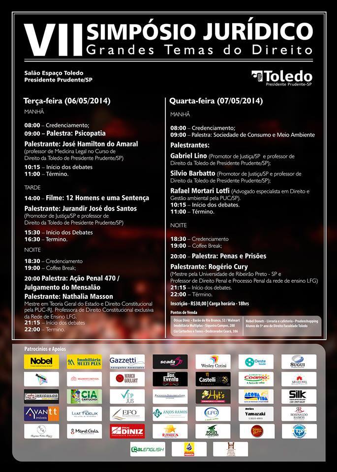 Nos dias 6 e 7 de maio, acontecerá na Toledo Presidente Prudente, o VII Simpósio Jurídico. Como em todos os anos, o evento é organizado por membros das comissões de formatura.