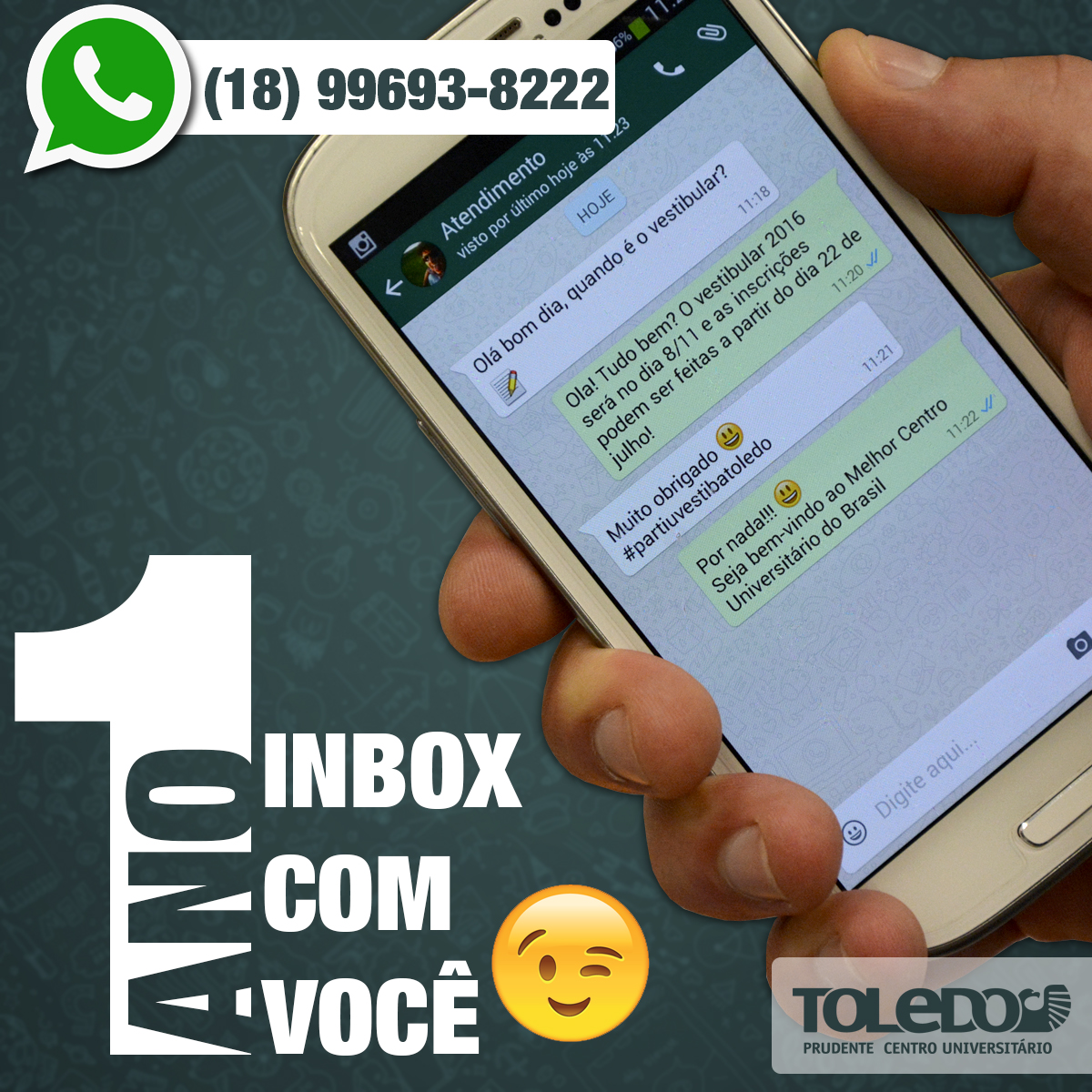 O número para fazer contato com a Toledo Prudente é o (18) 99693-8222 e contempla apenas o serviço para WhatsApp. As ligações telefônicas para a Toledo Prudente continuam a ser realizadas no número (18) 3901-4000. O atendimento será feito de segunda a sexta feira, das 8h às 22h.