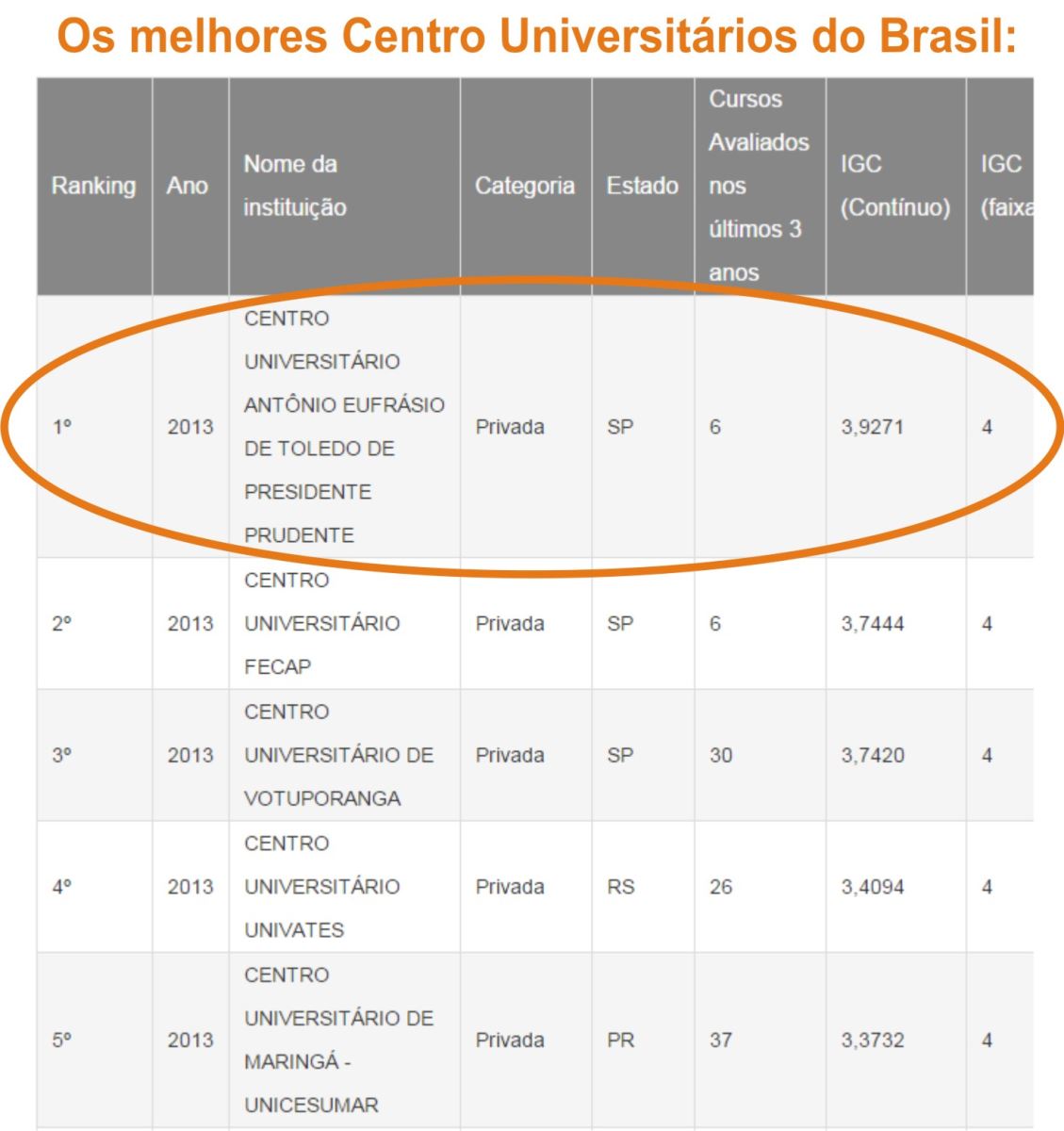 Em todo Brasil, das 2.136 instituições de ensino superior (universidades, faculdades e centros universitários) avaliadas apenas 30 instituições foram citadas e a Toledo Prudente lidera em sua categoria.
