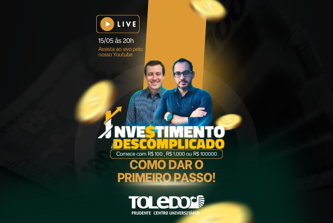 A Toledo Prudente está com as inscrições abertas para a palestra Investimento Descomplicado: Como Dar o Primeiro Passo. Ela será realizada online no dia 15, às 20h, de forma gratuita e será aberto para todos os públicos. Com ele, você aprenderá a lidar com o mercado financeiro de maneira segura e eficiente, para que os seus investimentos sejam mais conscientes e estratégicos.