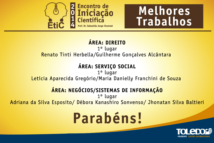 Sobre – Os premiados da 10ª edição do ETIC devem entrar em contato com NEPE (Núcleo de Extensão e Pesquisa) de segunda a sexta das 08h às 12h; das 13h às 17h e das 18h às 22h; pelo telefone (18) 39014004 ou pelo email: nepe@toledoprudente.edu.br